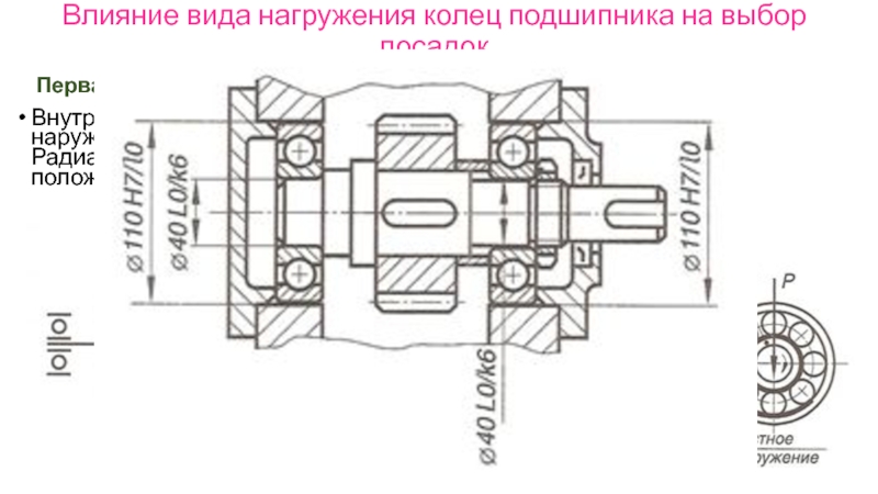 Внутренние кольца подшипников вращаются вместе с валом, наружные кольца, установленные в корпусе, неподвижны. Радиальная нагрузка Р постоянна по величине и не меняет своего положения относительно корпуса.