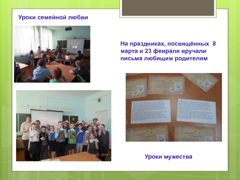 На праздниках, посвящённых 8 марта и 23 февраля вручали письма любящим родителям Уроки семейной любвиУроки мужества