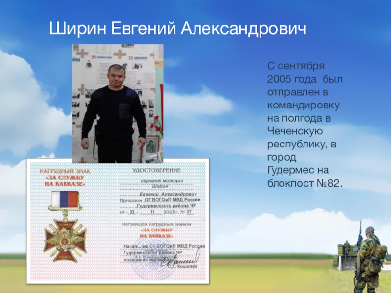 г. Остров 3. Прослужил там полгода, получил специальность механик – водитель механизированных мостов. Потом перевели в боевую часть в г. Иваново. Прослужив еще полгода, по собственному желанию направлен на Северный Кавказ в инженерно – дорожный батальон (саперы). После восьмимесячной командировки вернулся в свою часть в г. Иваново, а через месяц, в октябре 2003 г., демобилизовался.
