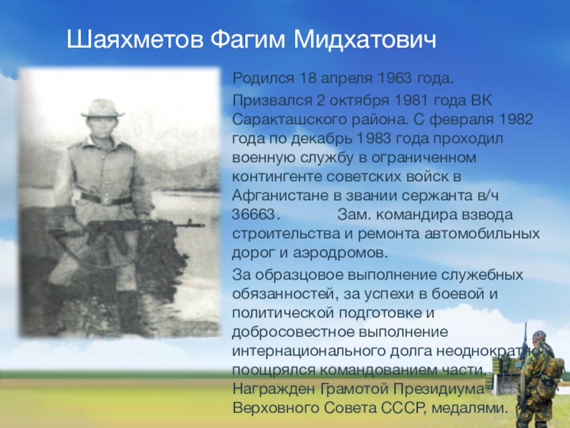 марта 1983 года Саракташским военным комиссариатом был призван в ряды Вооруженных Сил. Выполнял интернациональный долг в Афганистане с июня 1983 года по август 1985 года в составе в/ч пп 51932 в звании рядового. Награжден медалью «За боевые заслуги», Грамотой Президиума Верховного Совета СССР, юбилейными медалями. Скончался 4 января 2002 года