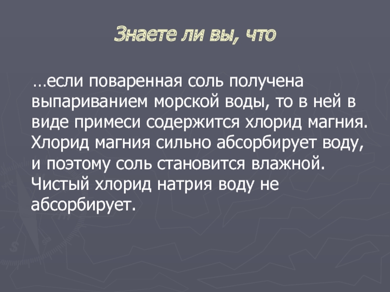 магния. Хлорид магния сильно абсорбирует воду, и поэтому соль становится влажной. Чистый хлорид натрия воду не абсорбирует.