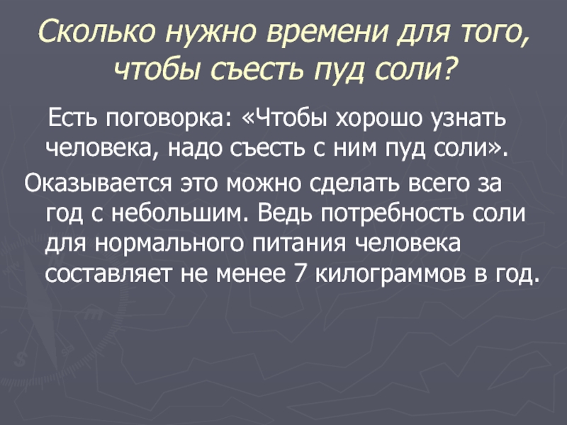 Слайд 17Сколько нужно времени для того, чтобы съесть пуд соли?