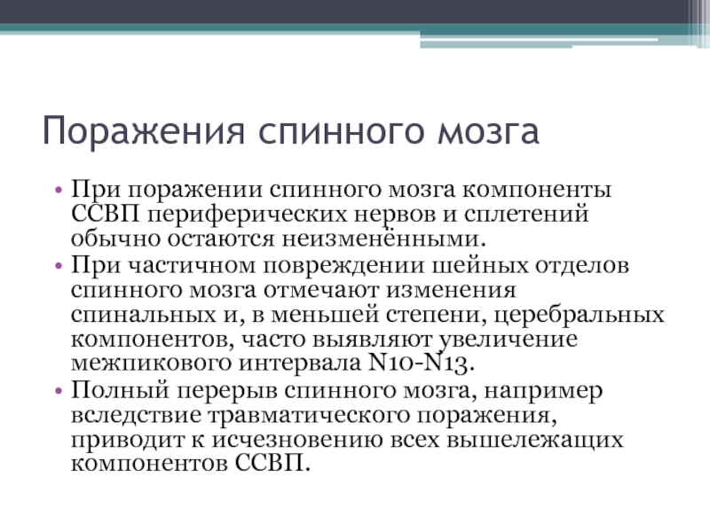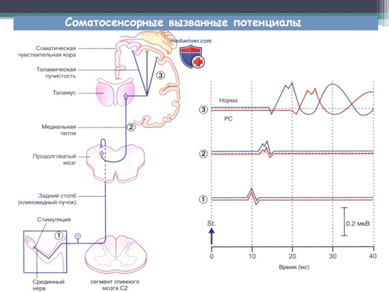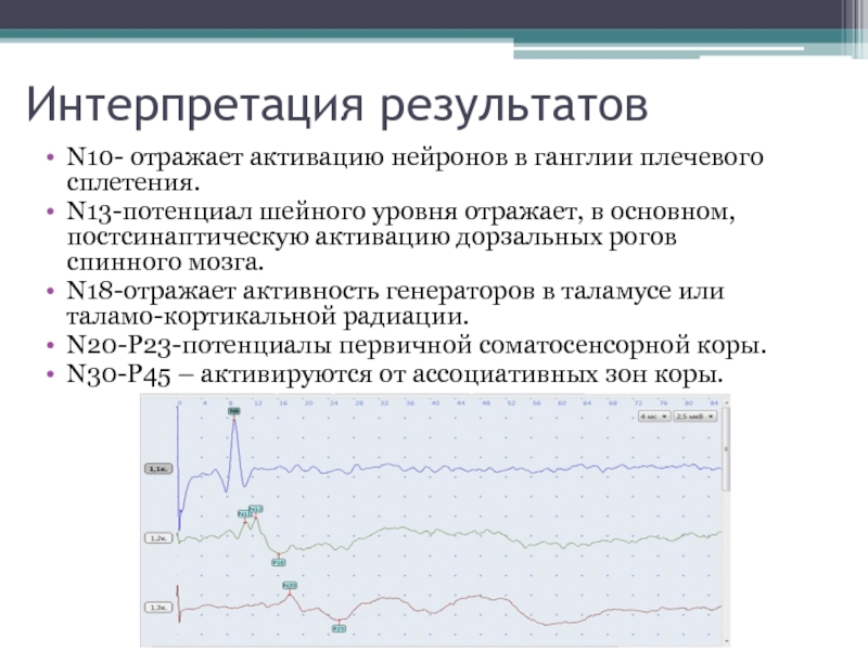 Ответная реакция регистрируемых нервных центров на графике будет обозначена символами: N9 (отклик плечевого сплетения)→ N11 (шейный отдел спинного мозга) → N20 – P25 (кора головного мозга).