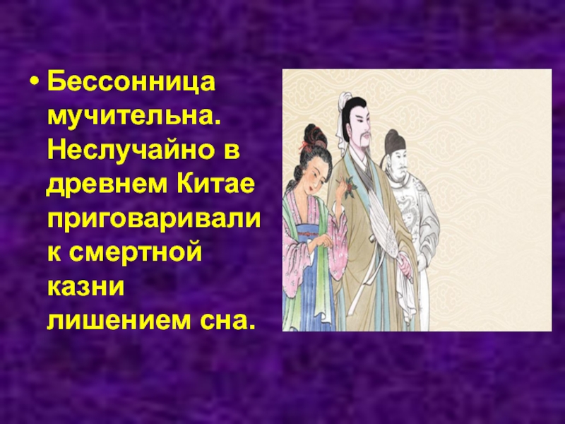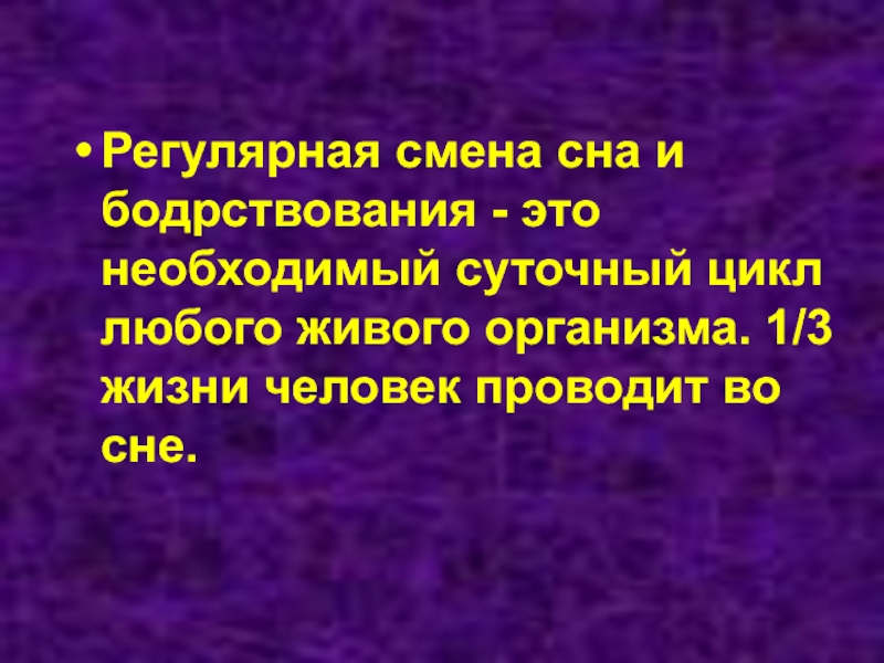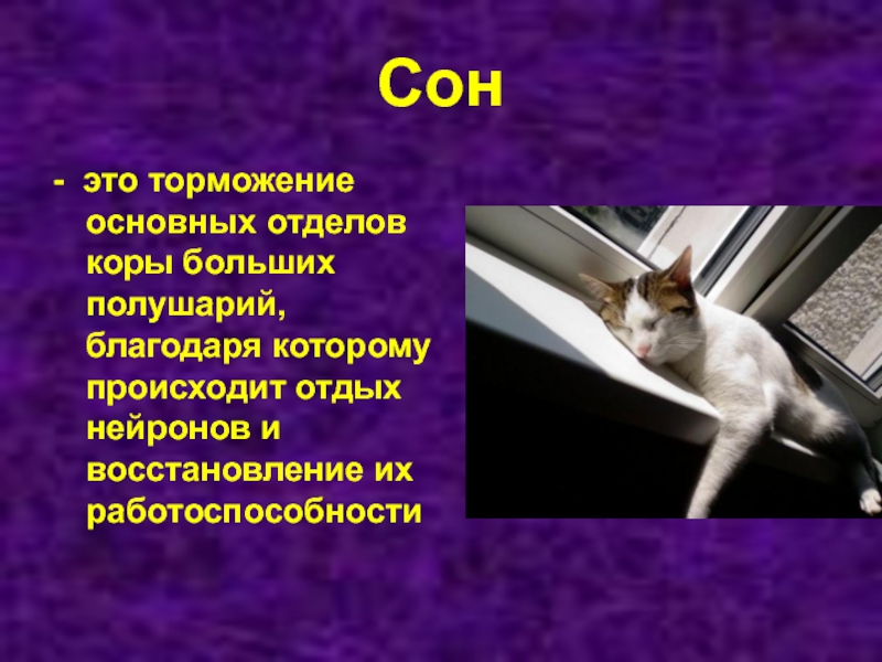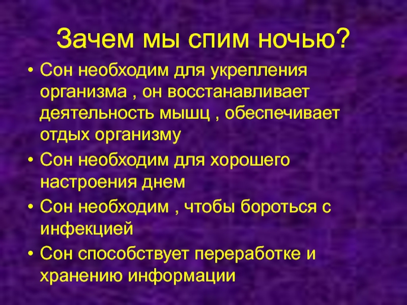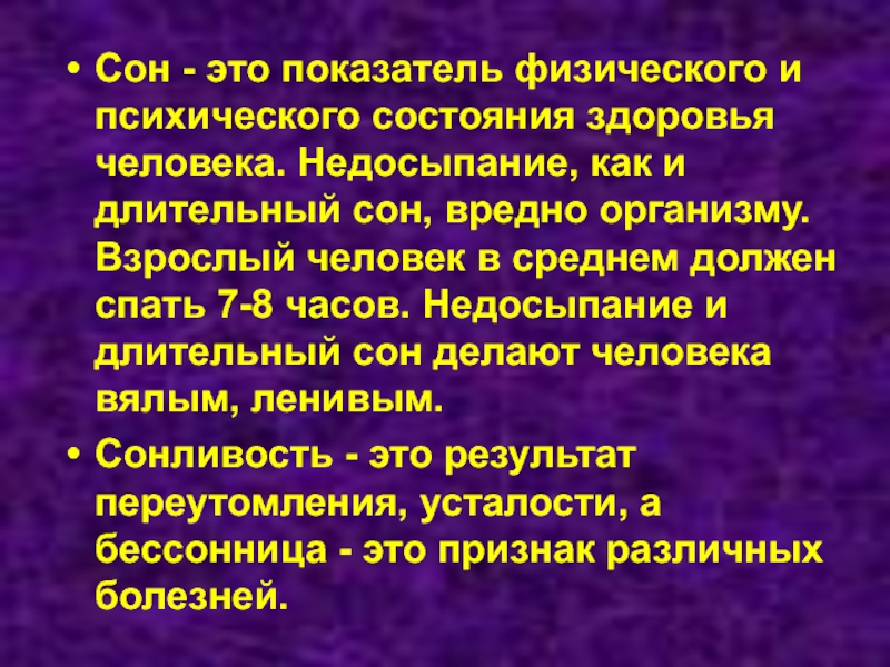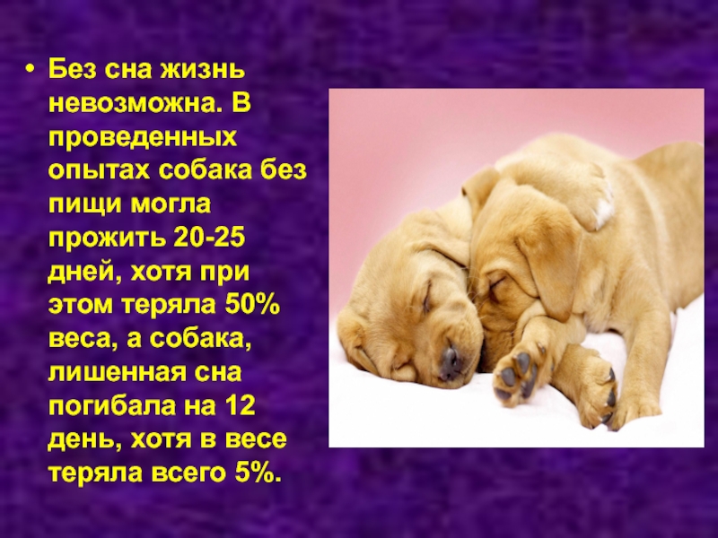 Без сна жизнь невозможна. В проведенных опытах собака без пищи могла прожить 20-25 дней, хотя при этом теряла 50% веса, а собака, лишенная сна погибала на 12 день, хотя в весе теряла всего 5%.
