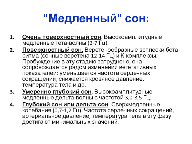 Пробуждение в эту стадию затруднено, она сопровождается рядом изменений вегетативных показателей: уменьшается частота сердечных сокращений, снижается кровяное давление, температура тела и др.