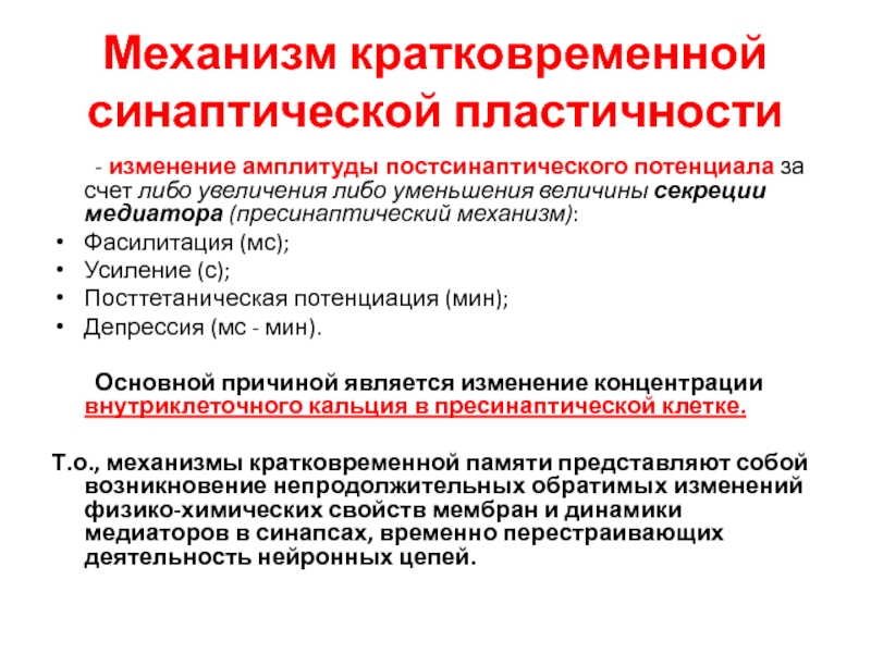 Т.о., механизмы кратковременной памяти представляют собой возникновение непродолжительных обратимых изменений физико-химических свойств мембран и динамики медиаторов в синапсах, временно перестраивающих деятельность нейронных цепей.