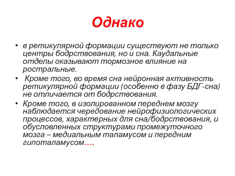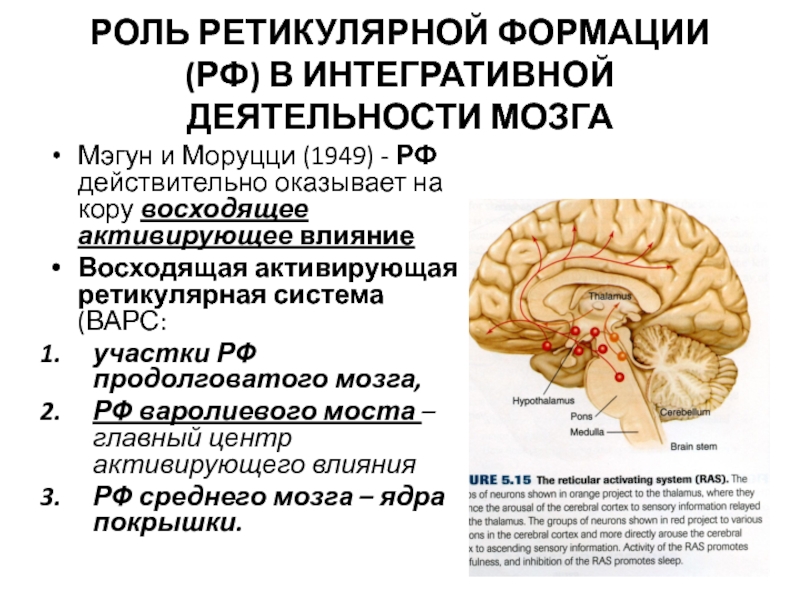 Слайд 2РОЛЬ РЕТИКУЛЯРНОЙ ФОРМАЦИИ (РФ) В ИНТЕГРАТИВНОЙ ДЕЯТЕЛЬНОСТИ МОЗГА