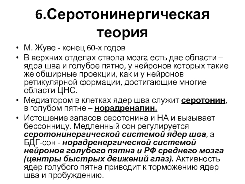 Фаза медленного сна: ГАМК, серотонин, норадреналин, ацетилхолин, глутамат,