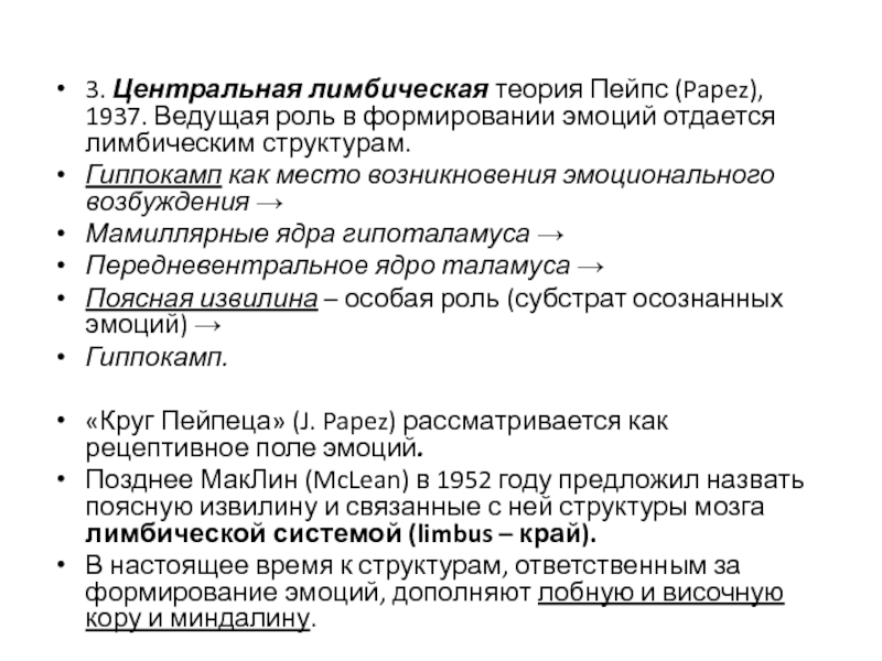 «Круг Пейпеца» (J. Papez) рассматривается как рецептивное поле эмоций.