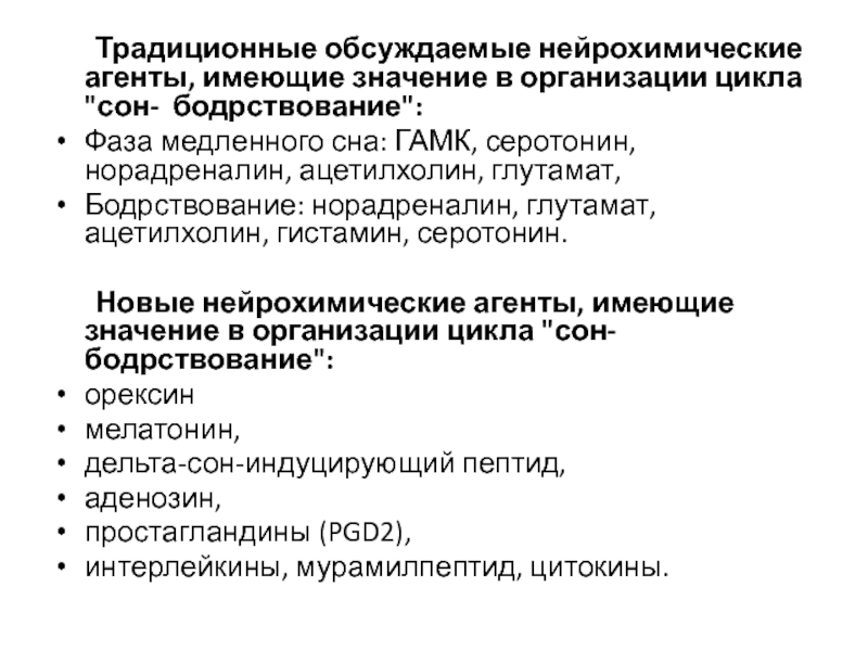 Слайд 13 Традиционные обсуждаемые нейрохимические агенты, имеющие значение в организации цикла "сон-