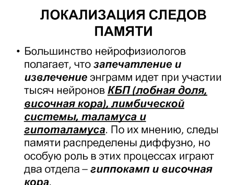 Слайд 37ЛОКАЛИЗАЦИЯ СЛЕДОВ ПАМЯТИ