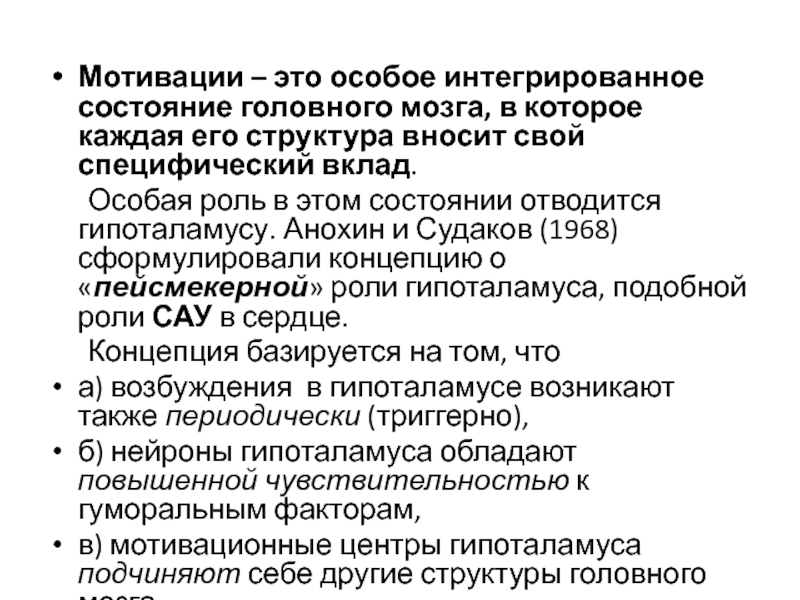 этом состоянии отводится гипоталамусу. Анохин и Судаков (1968) сформулировали концепцию о «пейсмекерной» роли гипоталамуса, подобной роли САУ в сердце.