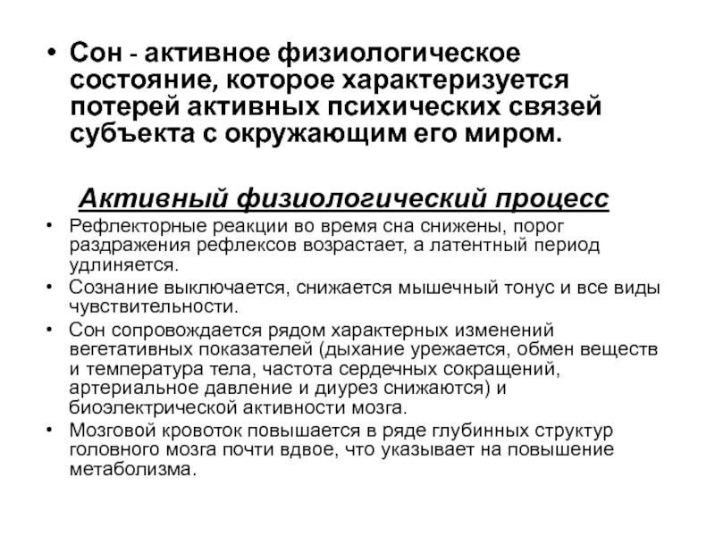 Слайд 5Сон - активное физиологическое состояние, которое характеризуется потерей активных психических