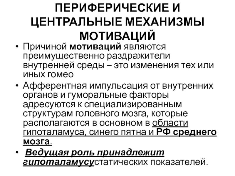Слайд 40ПЕРИФЕРИЧЕСКИЕ И ЦЕНТРАЛЬНЫЕ МЕХАНИЗМЫ МОТИВАЦИЙ