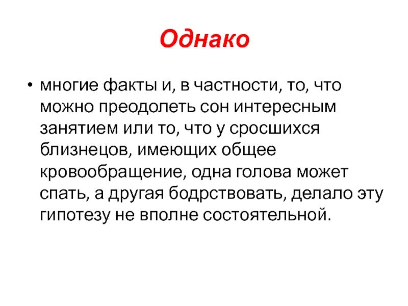 кровообращение, одна голова может спать, а другая бодрствовать, делало эту гипотезу не вполне состоятельной.