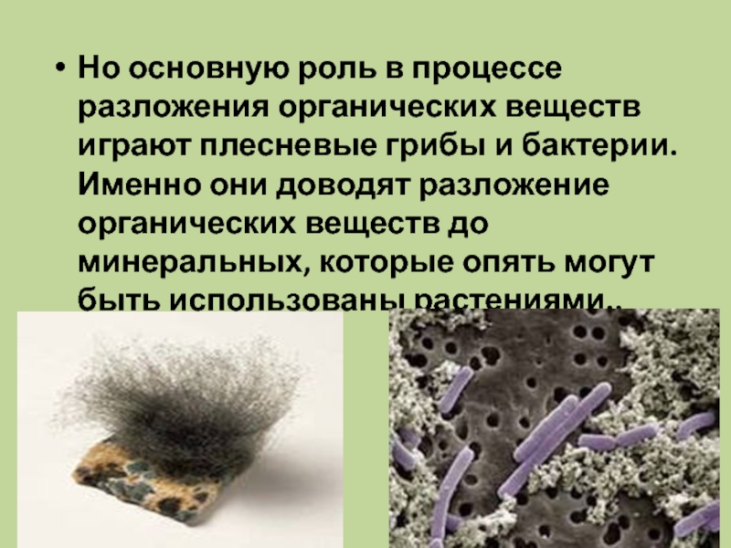 Слайд 14Но основную роль в процессе разложения органических веществ играют плесневые