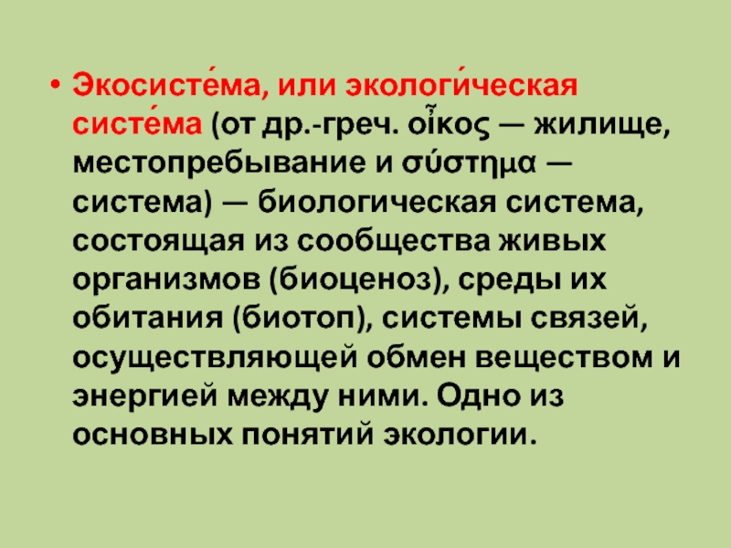 Слайд 16Экосисте́ма, или экологи́ческая систе́ма (от др.-греч. οἶκος — жилище, местопребывание