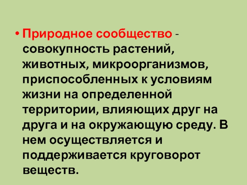 Слайд 8Природное сообщество - совокупность растений, животных, микроорганизмов, приспособленных к условиям