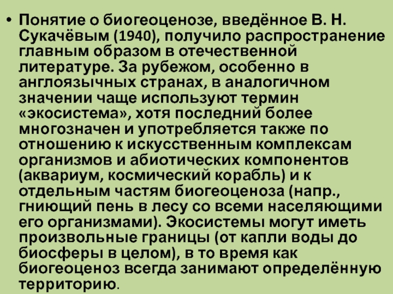 Слайд 7Понятие о биогеоценозе, введённое В. Н. Сукачёвым (1940), получило распространение