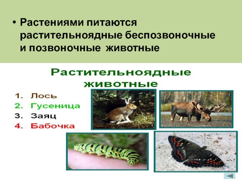 Слайд 11Растениями питаются растительноядные беспозвоночные и позвоночные животные