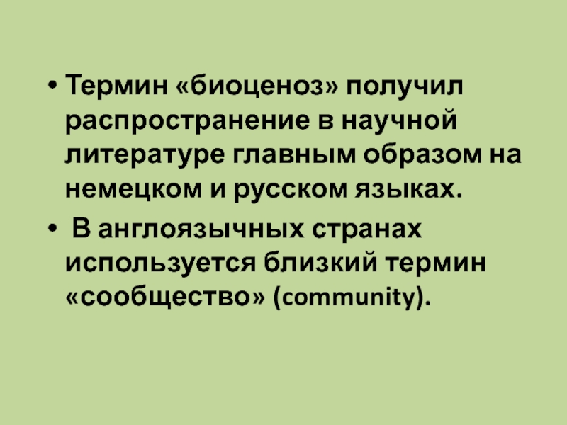 Слайд 5Термин «биоценоз» получил распространение в научной литературе главным образом на