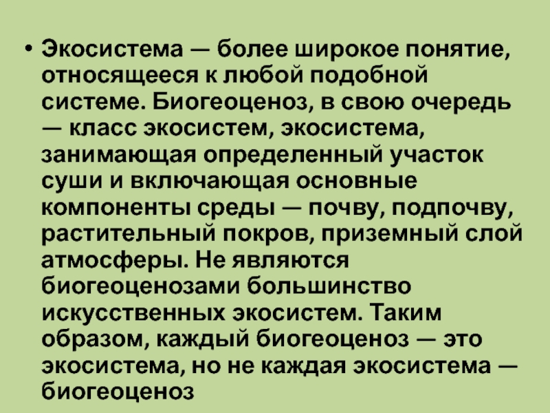 участок суши и включающая основные компоненты среды — почву, подпочву, растительный покров, приземный слой атмосферы. Не являются биогеоценозами большинство искусственных экосистем. Таким образом, каждый биогеоценоз — это экосистема, но не каждая экосистема — биогеоценоз