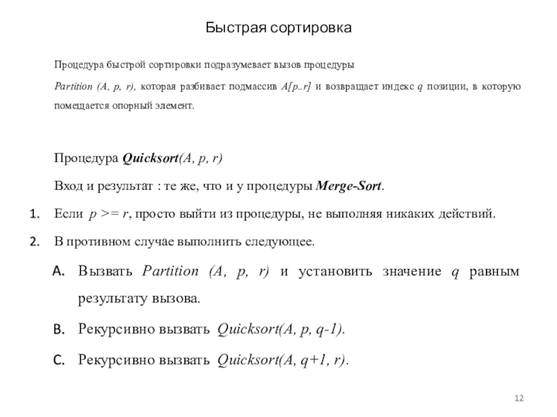 Первоначальный вызов Quicksort(A, 1, r) аналогичен вызову процедуры Merge-Sort.