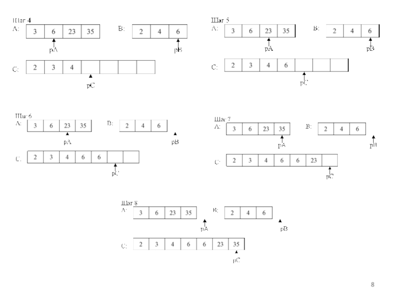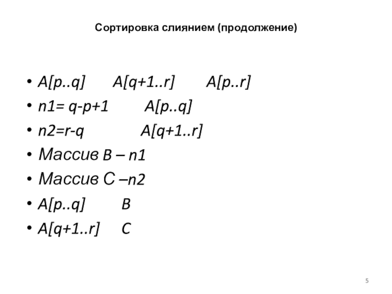 Результат: подмассив А[p.. r], содержащий все элементы, находившиеся в подмассивах А[p..q] и A[q+1..r], но теперь подмассив А[p.. r] отсортирован.