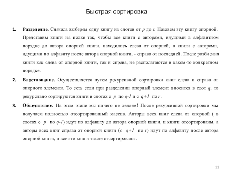 Властвование. Осуществляется путем рекурсивной сортировки книг слева и справа от опорного элемента. То есть если при разделении опорный элемент вносится в слот q, то рекурсивно сортируются книги в слотах с p по q-1 и с q+1 по r .