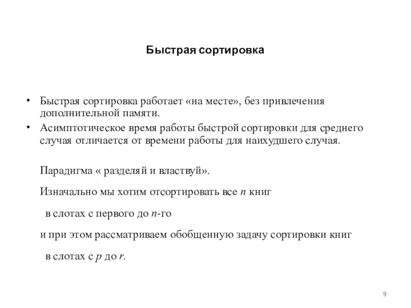 Быстрая сортировка работает «на месте», без привлечения дополнительной памяти.