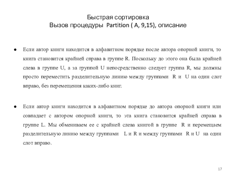так, чтобы все книги с авторами, идущими в алфавитном порядке до автора опорной книги, находились слева от опорной, а книги с авторами, идущими по алфавиту после автора опорной книги, - справа от последней. После разбиения книги как слева от опорной книги, так и справа, не располагаются в каком-то конкретном порядке.