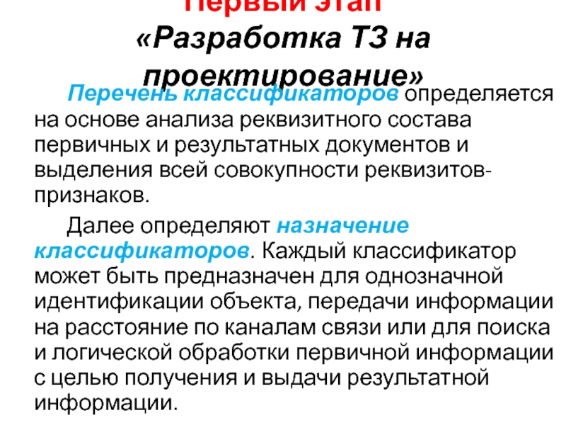 Далее определяют назначение классификаторов. Каждый классификатор может быть предназначен для однозначной идентификации объекта, передачи информации на расстояние по каналам связи или для поиска и логической обработки первичной информации с целью получения и выдачи результатной информации.