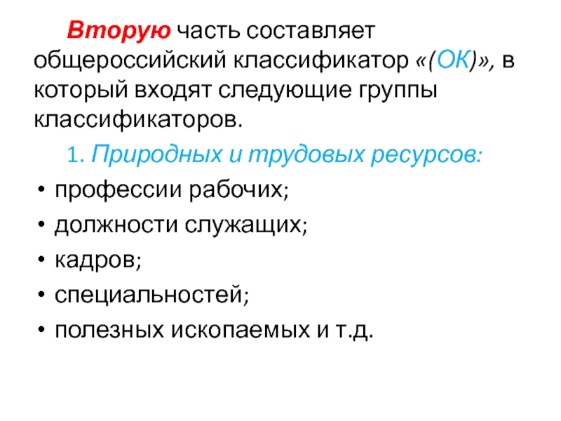 Слайд 34Вторую часть составляет общероссийский классификатор «(ОК)», в который входят следующие