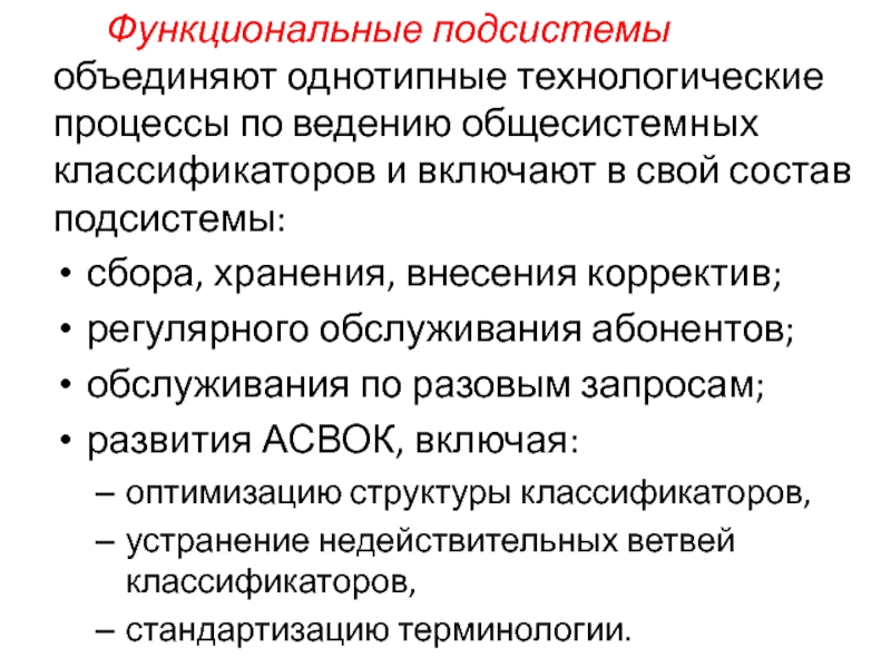 Слайд 45Функциональные подсистемы объединяют однотипные технологические процессы по ведению общесистемных классификаторов