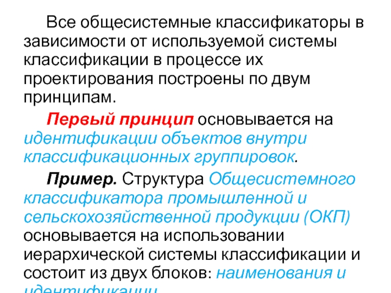 Пример. Структура Общесистемного классификатора промышленной и сельскохозяйственной продукции (ОКП) основывается на использовании иерархической системы классификации и состоит из двух блоков: наименования и идентификации.