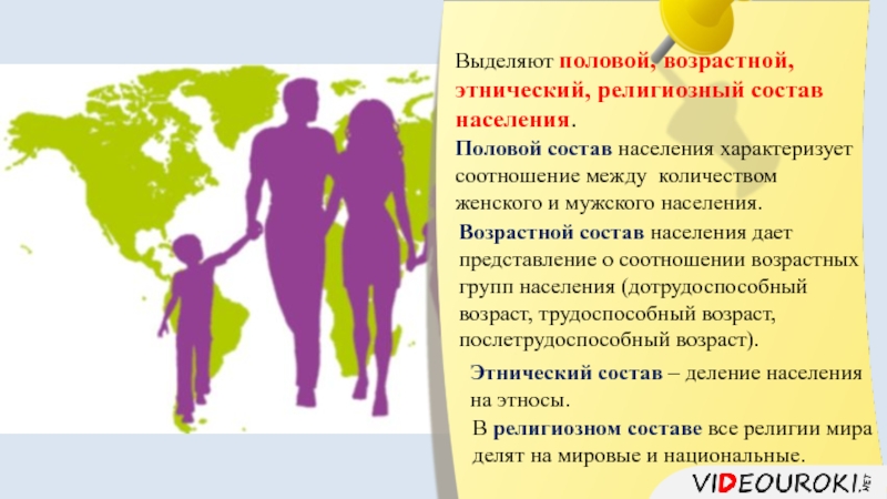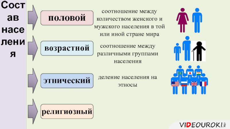 Выделяют половой, возрастной, этнический, религиозный состав населения.