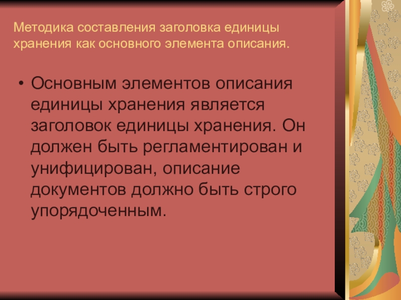 Слайд 19Методика составления заголовка единицы хранения как основного элемента описания.