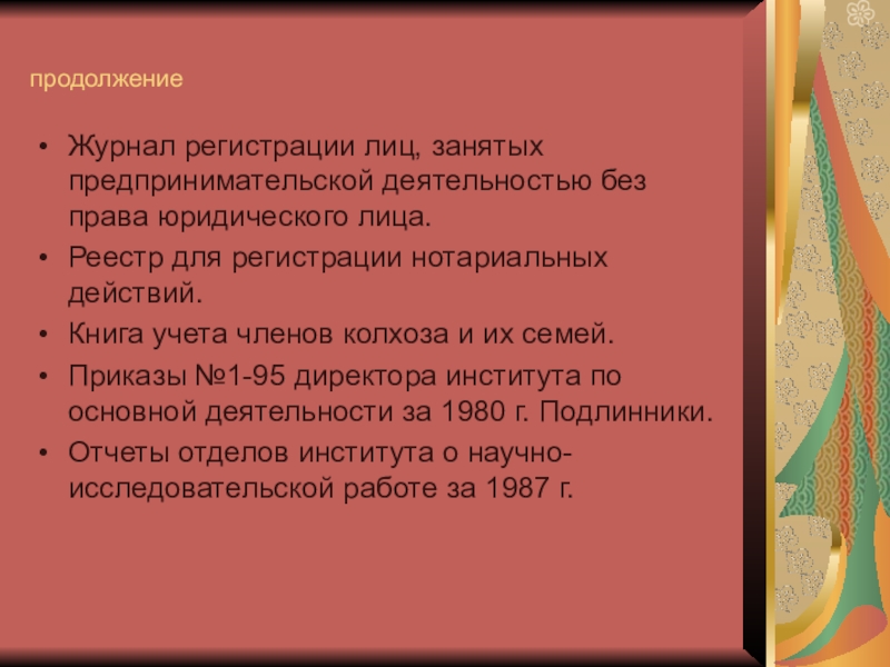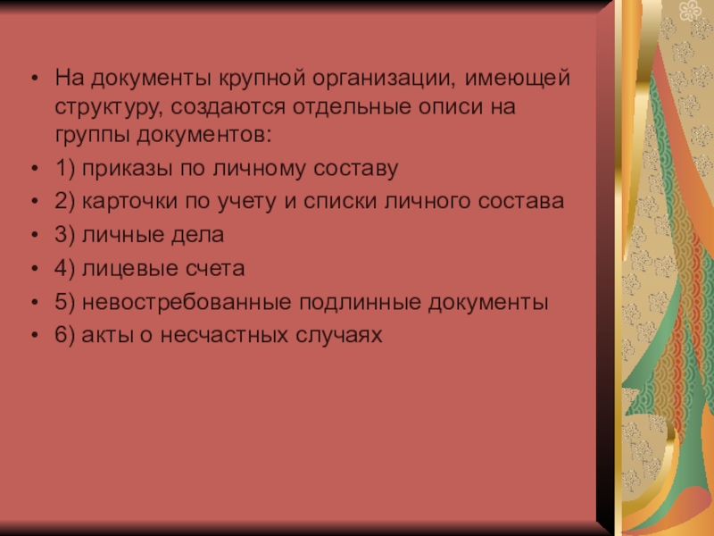 Слайд 25На документы крупной организации, имеющей структуру, создаются отдельные описи на