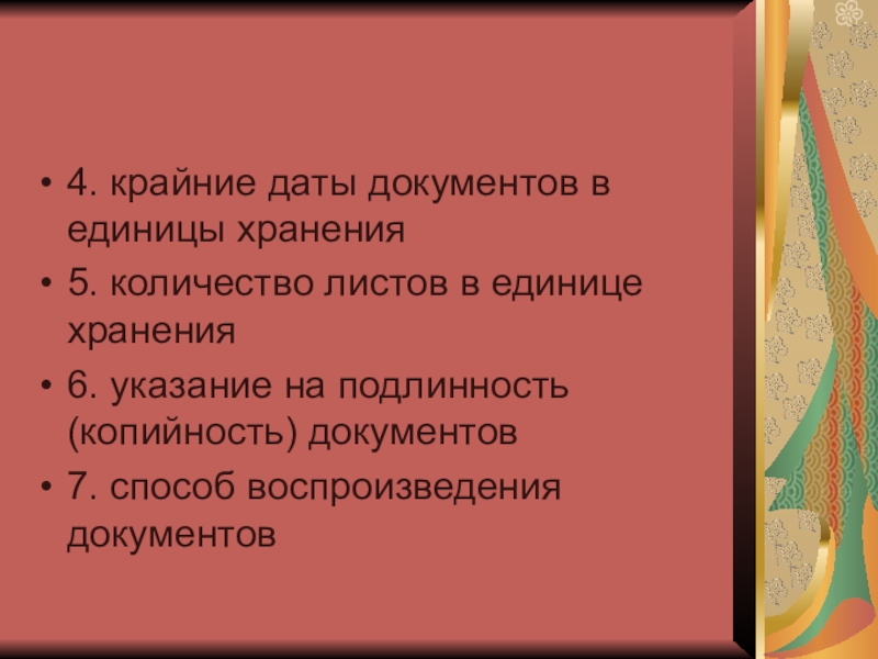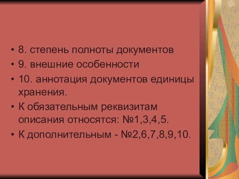 полноты документа, внешние особенности единицы хранения, аннотация документов.
