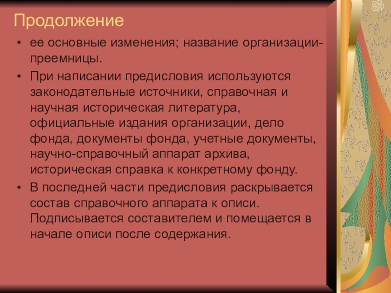 Предисловие может быть более простым по структуре: даты возникновения и ликвидации организации; название организации-предшественницы, основные функции и структуру организации;