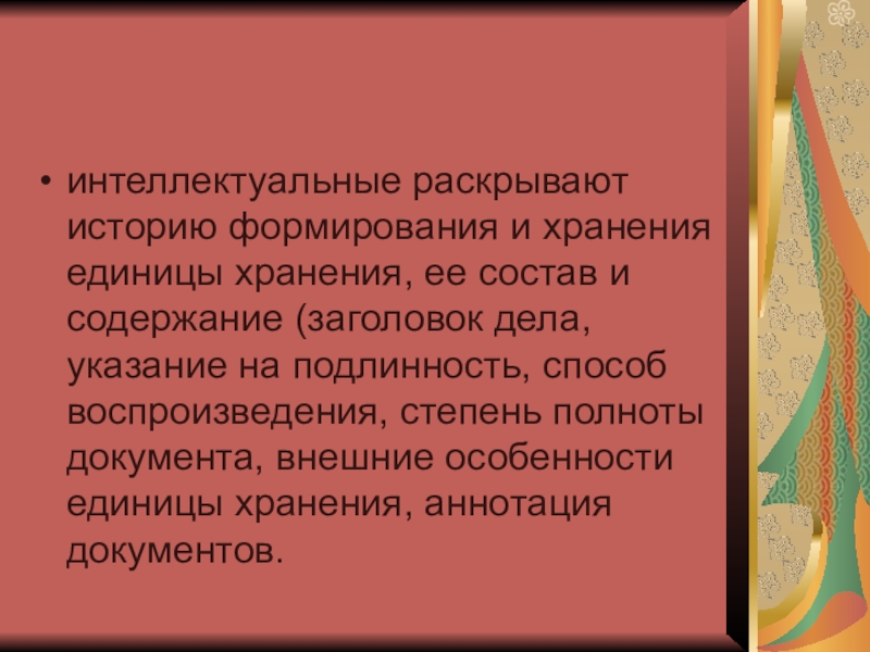 Слайд 10интеллектуальные раскрывают историю формирования и хранения единицы хранения, ее состав