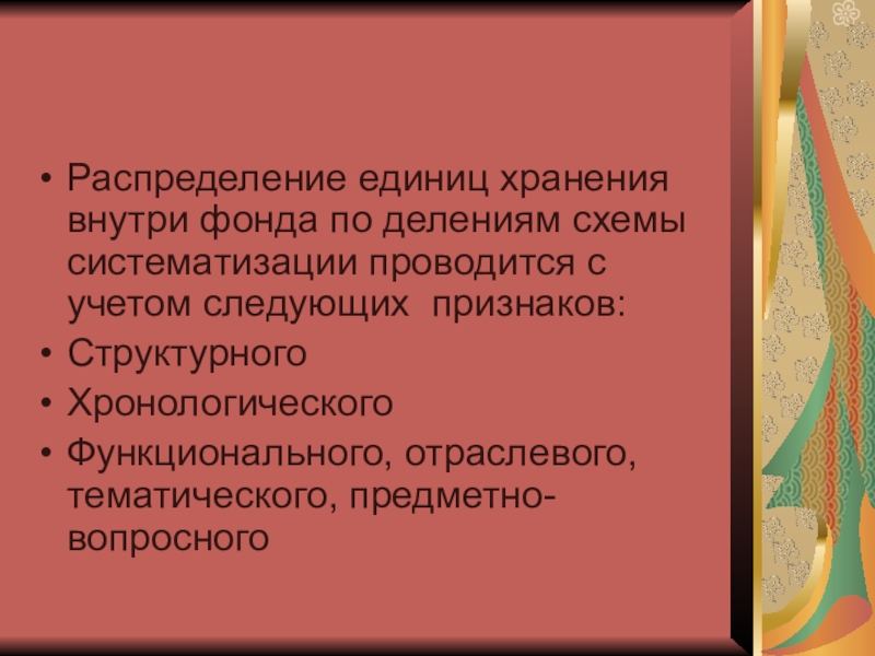 Слайд 13Распределение единиц хранения внутри фонда по делениям схемы систематизации проводится