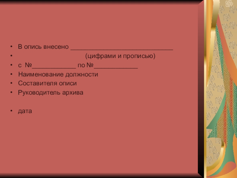 Слайд 4Опись состоит из описательных статей, итоговой записи, листа заверителя и