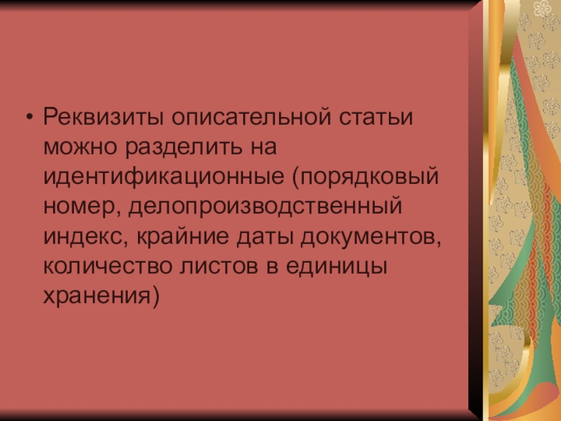Слайд 9Реквизиты описательной статьи можно разделить на идентификационные (порядковый номер, делопроизводственный