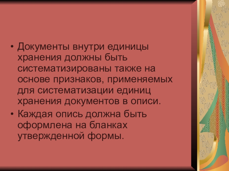 Слайд 15Документы внутри единицы хранения должны быть систематизированы также на основе
