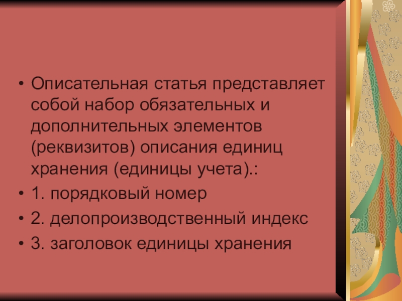 Слайд 6Описательная статья представляет собой набор обязательных и дополнительных элементов (реквизитов)
