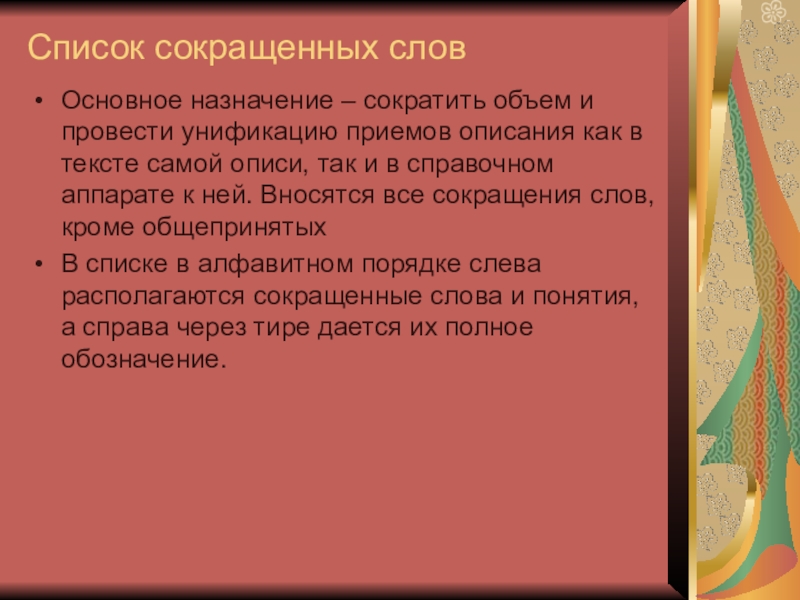 справочном аппарате к ней. Вносятся все сокращения слов, кроме общепринятых