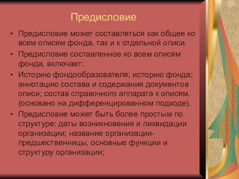 фондообразователя; историю фонда; аннотацию состава и содержания документов описи; состав справочного аппарата к описям. (основано на дифференцированном подходе).