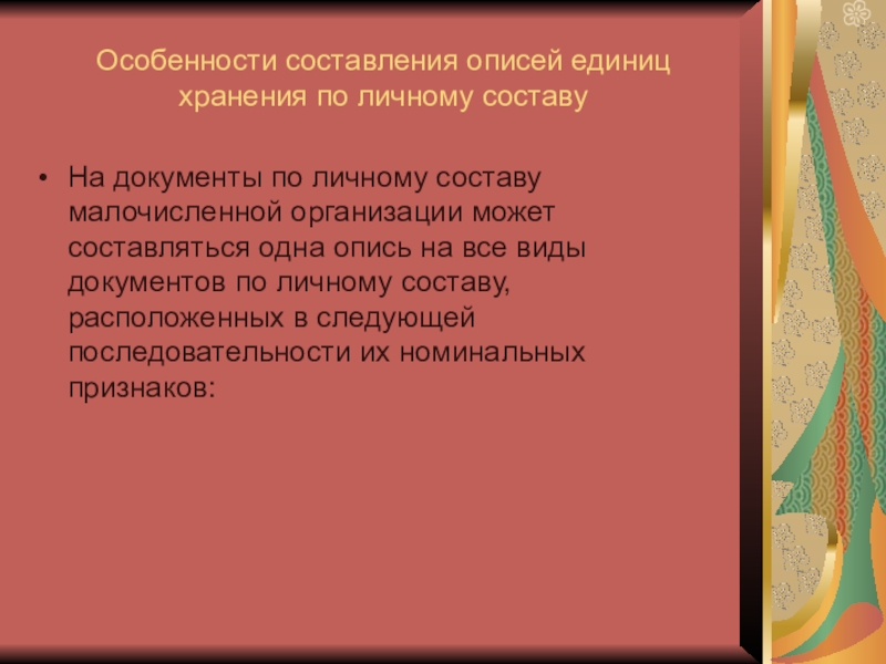 Слайд 23Особенности составления описей единиц хранения по личному составу