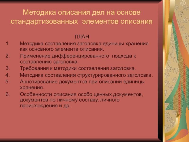 Слайд 18Методика описания дел на основе стандартизованных элементов описания